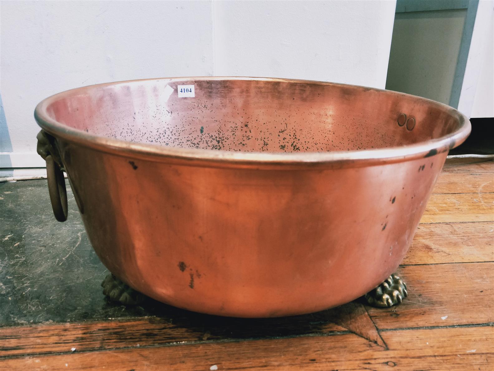 A COPPER CAULDRON ON LION PAW FEET (A/F), H. 19CM X DIA. 41.5CM, LEONARD JOEL LOCAL DELIVERY SIZE: MEDIUM