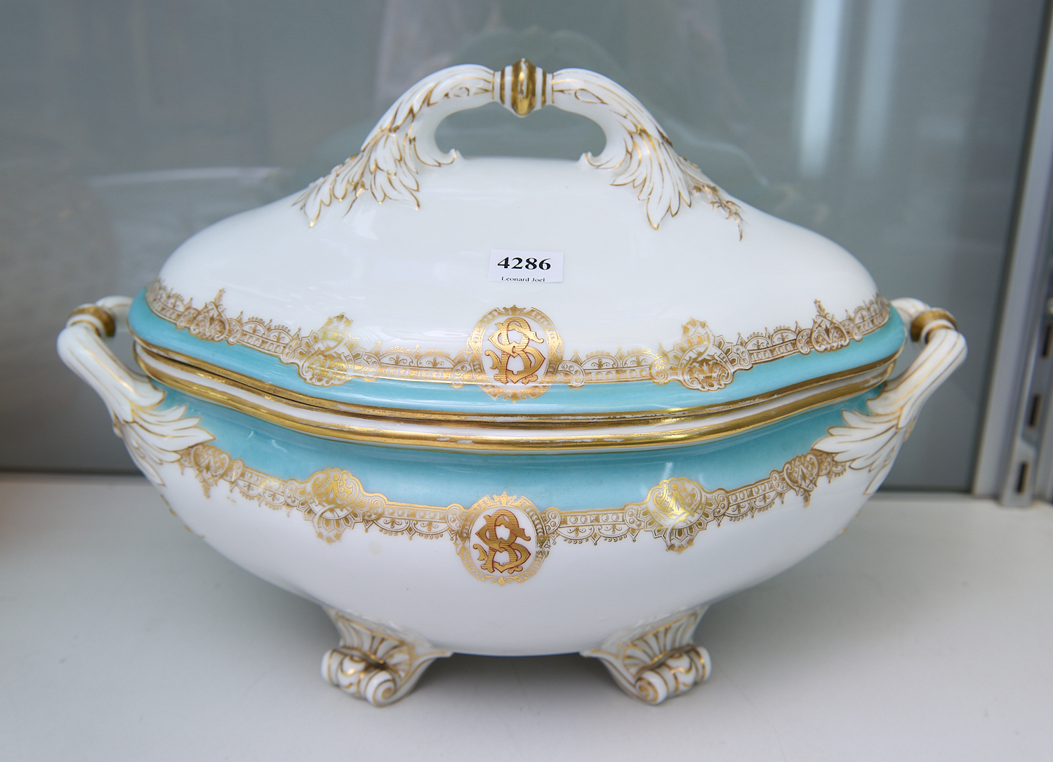 A PORCELAIN LIDDED TUREEN WITH GILT DECORATION, H. 37CM, LEONARD JOEL LOCAL DELIVERY SIZE: MEDIUM