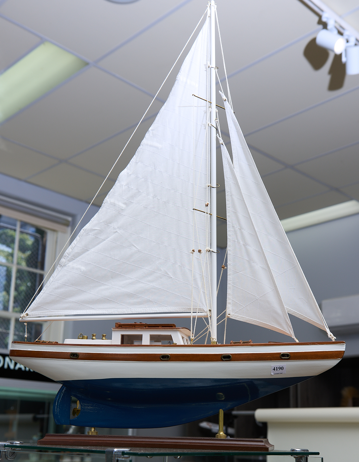 A MODEL YACHT ON WOODEN BASE H.87CM, LEONARD JOEL LOCAL DELIVERY SIZE: MEDIUM