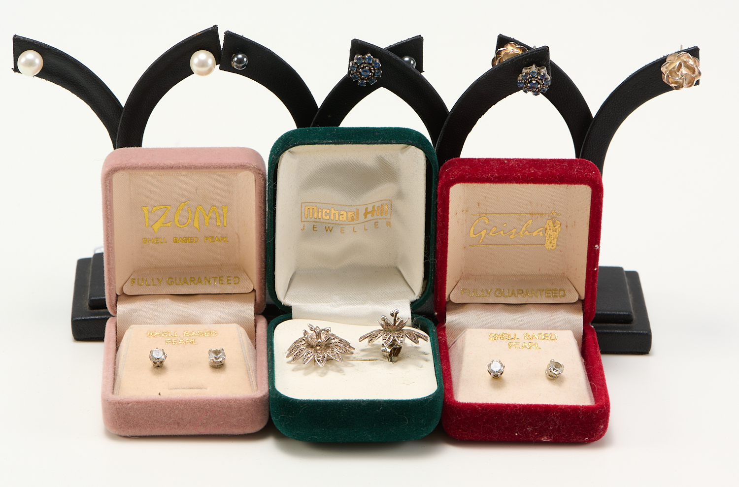 SOME EARRINGS SHOWING SIGNS OF WEAR, INCLUDING SUBTLE TARNISH AND MINOR GRIT IN SETTINGS