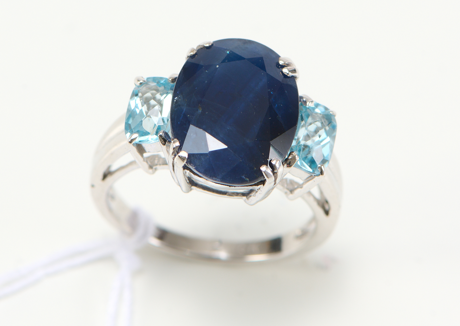A BLUE SAPPHIRE AND AQUAMARINE RING IN 18CT WHITE GOLD, THE SAPPHIRE WEIGHING 7.08CTS AND THE AQUAMARINES TOTALLING 1.10CTS, SIZE M, 5.6GMS