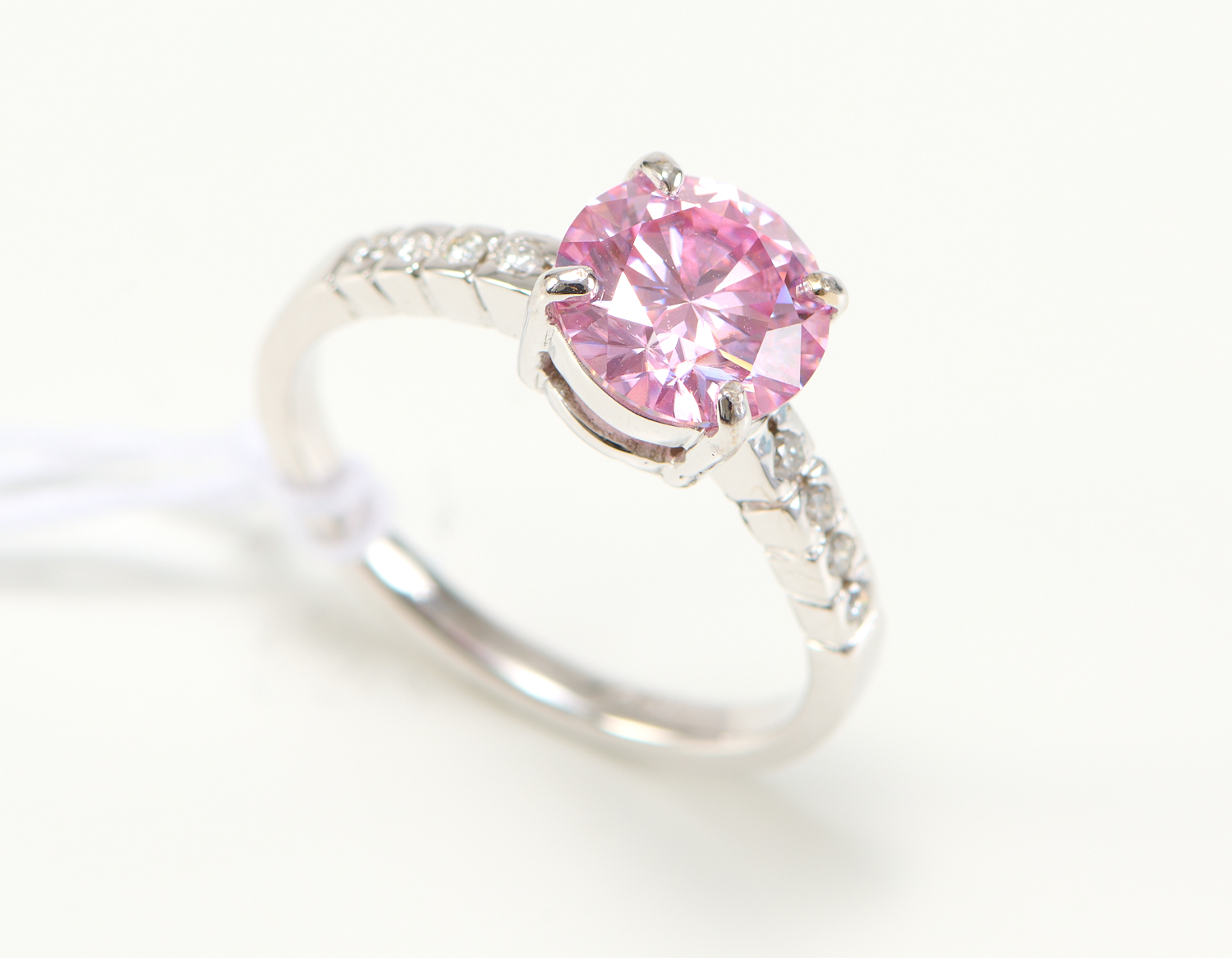 A PINK MOISSANITE AND DIAMOND RING, IN 18CT WHITE GOLD, SIZE M-N, 3.7GMS
