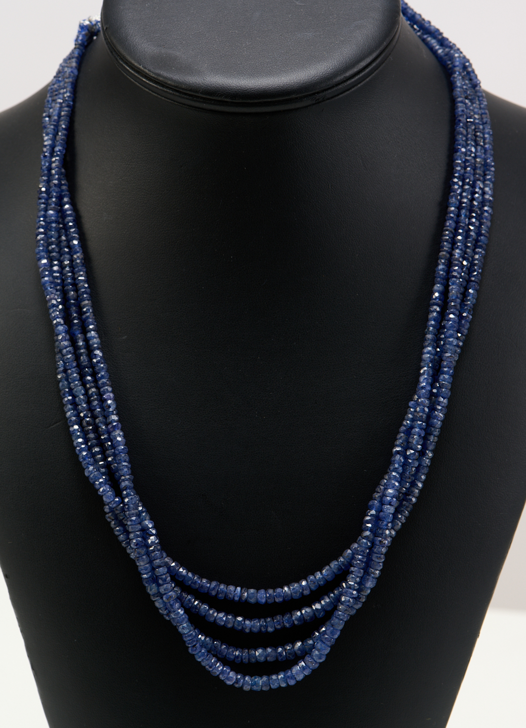 A FOUR STRAND BLUE SAPPHIRE BEAD NECKLACE, TO A BLUE AND SILVER ROPE FASTENING WITH SILDER
