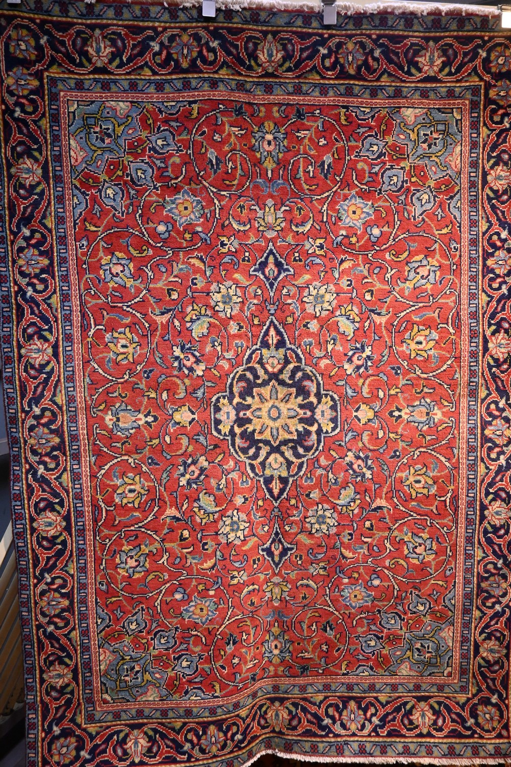 A CIRCA 1970'S PERSIAN SAROUQ MAHAL RUG, 100% WOOL. DENSE PILE. HAND-KNOTTED VILLAGE WEAVE WITH CLASSIC PERSIAN FLORAL DESIGN OF CENTRAL MEDALLION & CORNER MEDALLIONS IN RED FIELD OF PALMETTES AND FLORAL SPRAYS & SCROLLS. BORDER OF PALMETTES AND ROSETTES. RESTORED TO GALLERY CONDITION. SIZE: 207X143CM ORIGIN: IRAN - RRP: $2,800 DOCUMENTATION OF AUTHENTICITY INCLUDED.