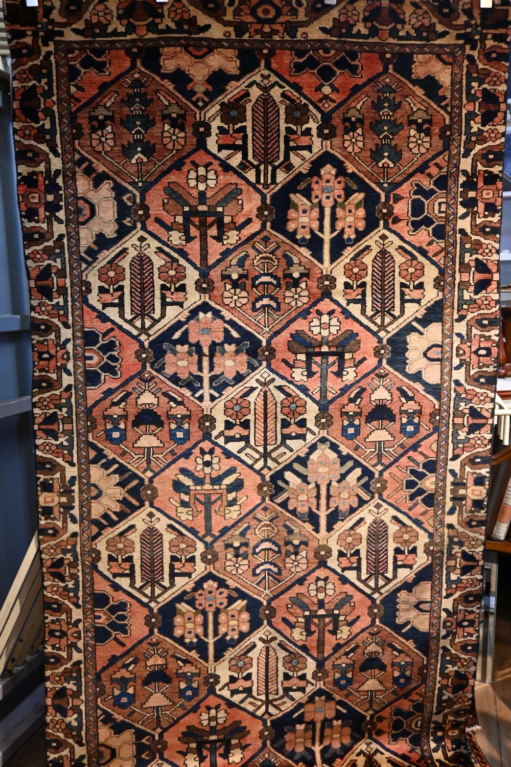 A TRIBAL CIRCA 1960'S PERSIAN BAKHTIAR BANDI RUG. 100% WOOL. HAND-KNOTTED TRIBAL BAKHTIARI WEAVE, TRADITIONAL "GARDEN" DESIGN WITH DIAMOND SHAPED PANELS CONTAINING GARDEN THEMES OF WILLOW TREES, FLORAL SHRUBS, PALMETTES AND PRAYER NICHES. BORDER OF TRIBAL MOTIFS. SIZE: 298X148CM ORIGIN: PERSIA - RRP: $2,800 DOCUMENTATION OF AUTHENTICITY INCLUDED.