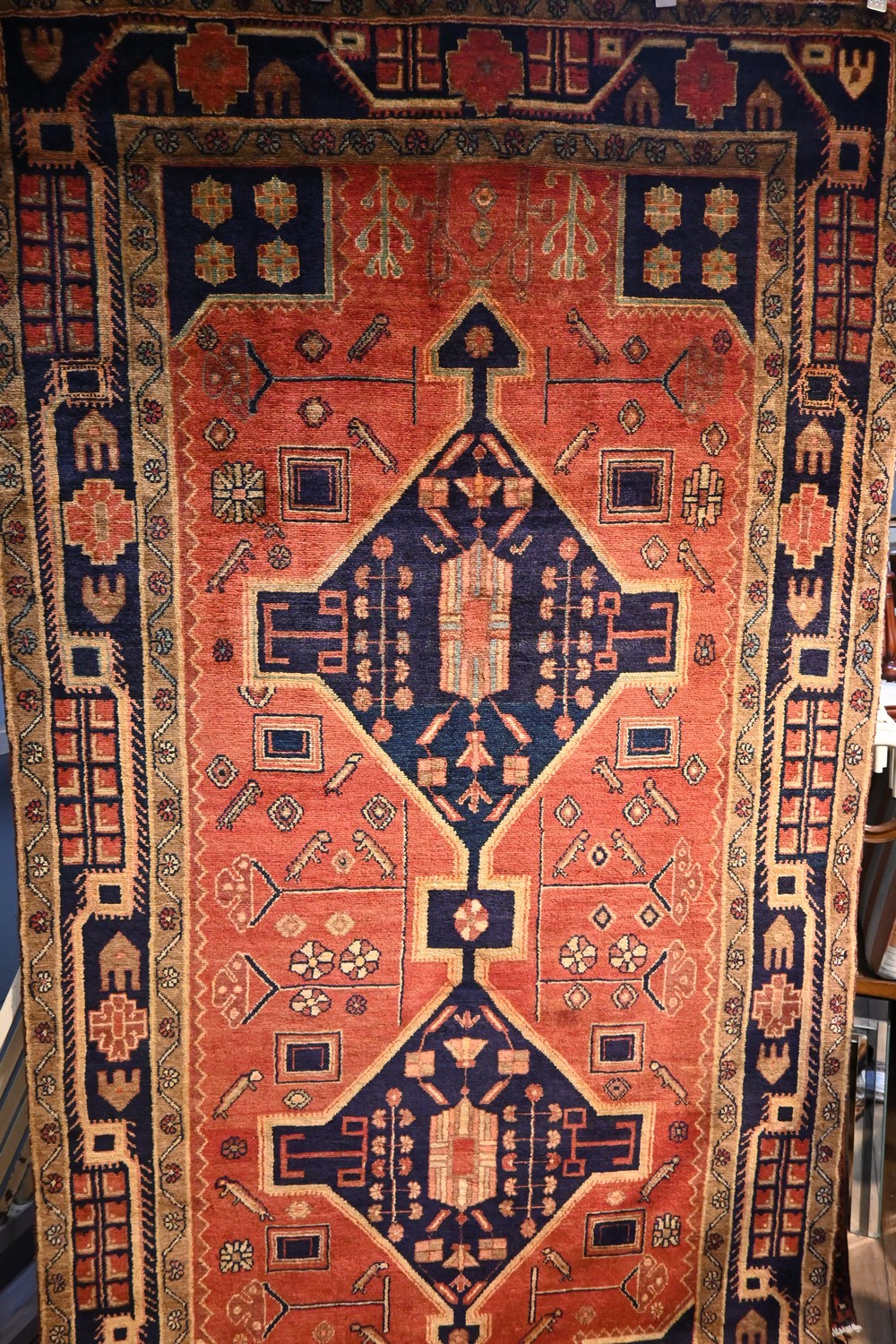 A BEAUTIFUL PERSIAN SONQOR KOLYAIE RUG. 100% WOOL, NATURAL DYES. SOLID & HARD-WEARING. HAND-KNOTTED VILLAGE WEAVE FROM THE KURDISTAN REGION WITH DESIGN OF DOUBLE ANCHORED ANGULAR MEDALLIONS IN CHARCOAL CONTAINING MOTIFS ON A SOFT RED FIELD. GEOMETRIC-PATTERNED BORDER. SIZE: 276X149CM ORIGIN: PERSIA - RRP: $2,700 DOCUMENTATION OF AUTHENTICITY INCLUDED.