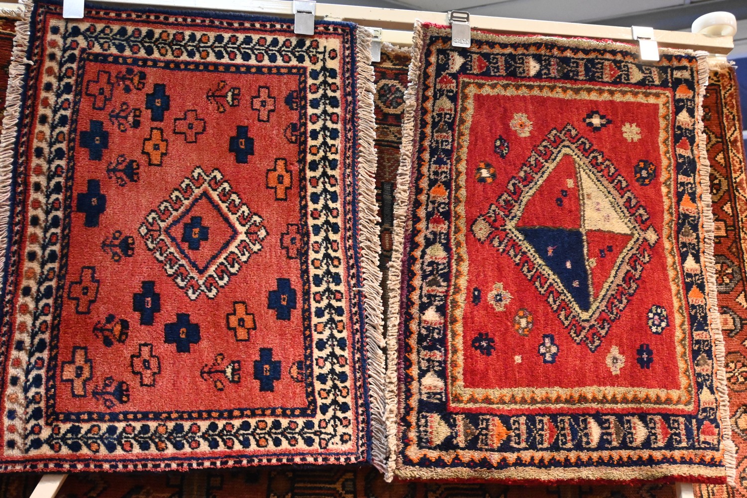 TWO PERSIAN NOMADIC SIRJAN ENTRANCE RUGS. 100% WOOL, SOLID AND DENSE. HAND-KNOTTED NOMADIC WEAVE & DESIGN OF A CENTRAL TRIBAL DIAMOND SHAPE MEDALLION AND TRIBAL MOTIFS IN A RED FIELD. BORDER OF TRIBAL MOTIFS. SIZE: 75X54CM- SIZE: 73X55CM ORIGIN: PERSIA - RRP: $500 DOCUMENTATION OF AUTHENTICITY INCLUDED.