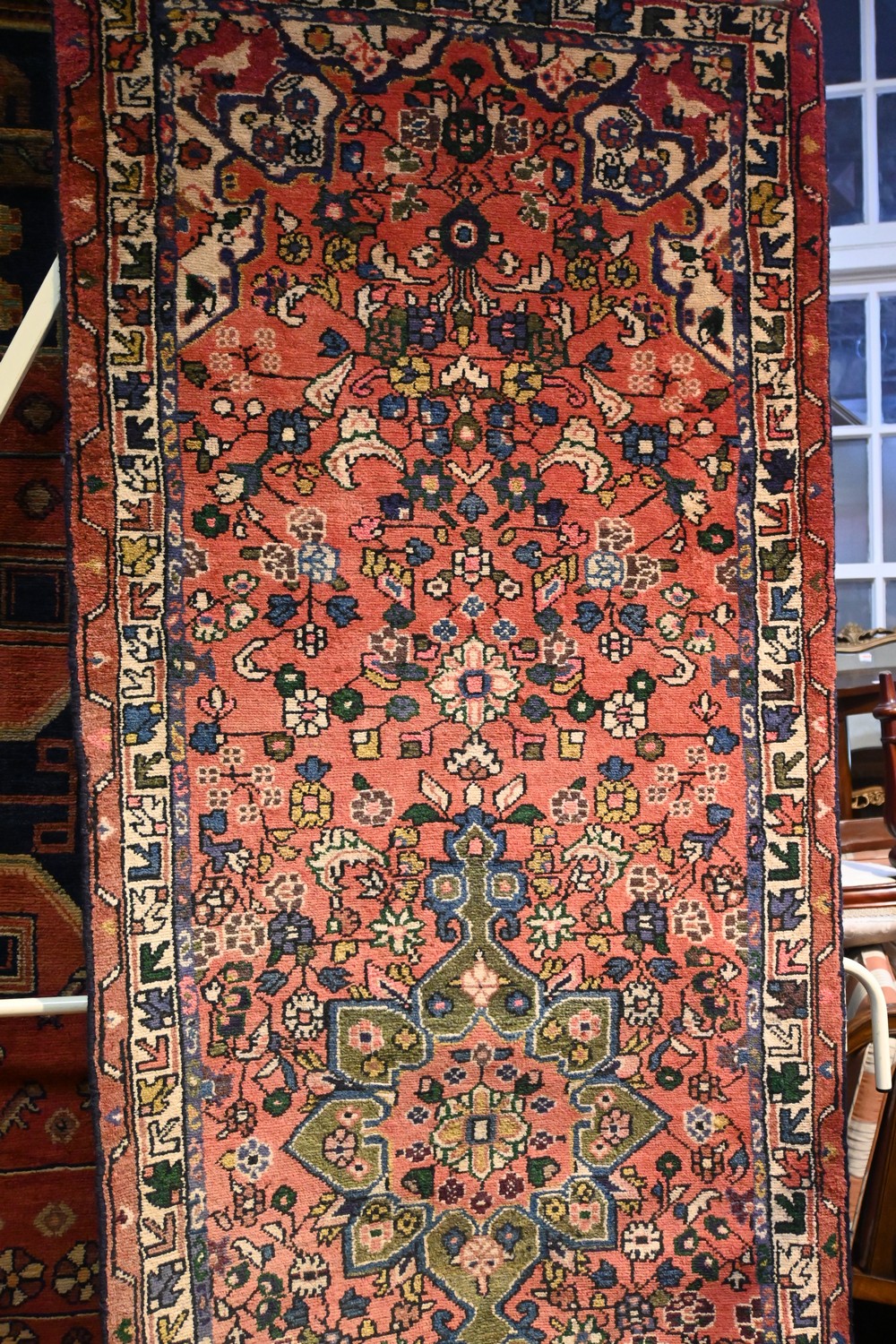 A PERSIAN HAMADAN HALL RUNNER. 100% WOOL. NATURAL DYES. TRADITIONAL DESIGN OF ALL-OVER FLORAL PATTERNS ON A RED FIELD. BORDER OF TRIBAL MOTIFS. SIZE: 272X90CM ORIGIN: IRAN