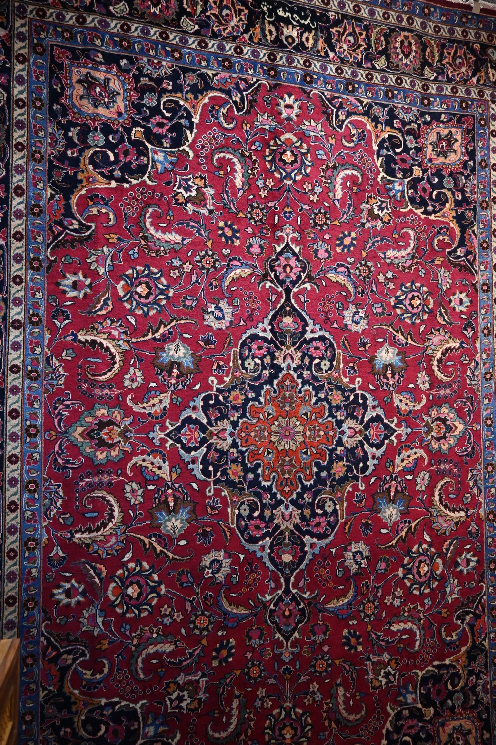 A MAGNIFICENT FINE PERSIAN SOLID WEAVE MASHAD RUG, FROM THE KHORASAN PROVINCE. 100% WOOL WITH A CENTRAL FLORAL MEDALLION AND CORNER MEDALLIONS WITH ALL OVER FLORAL DESIGN OF SHA ABBASI PALMETTES AND FLORAL TENDRILS ON A MAGENTA FIELD. BORDER OF PALMETTES ON A ROYAL BLUE FIELD. SIGNED PIECE FROM ATELIER "TAGHI HONARMAND" SIZE: 340X243CM ORIGIN: PERSIA - RRP: $6,900 DOCUMENTATION OF AUTHENTICITY INCLUDED.