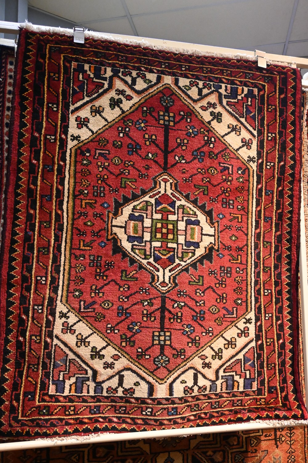 A PERSIAN HAMADAN RUG, 100% WOOL. DENSE PILE. HAND-KNOTTED VILLAGE WEAVE WITH TRIBAL DESIGN OF ANCHORED MEDALLION AND QUARTERED CORNER MEDALLIONS IN A RED-TONED FIELD OF HERATI MAHI PATTERNS. SIZE: 120X98CM ORIGIN: PERSIA - RRP: $900