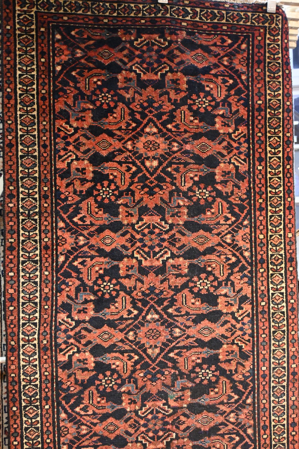 A COLLECTABLE CIRCA 1940'S PERSIAN BIDAR RUNNER. 100% WOOL, NATURAL DYES. HAND-KNOTTED BIDJAR WEAVE WITH TRADITIONAL DESIGN OF ALL-OVER FLORAL HERATI MAHI PATTERNS IN RED ON A NAVY-BLUE FIELD. BORDER OF TRIBAL MOTIFS & ROSETTES. RESTORED TO GALLERY CONDITION. SIZE: 248X100CM ORIGIN: PERSIA - RRP: $2,900 DOCUMENTATION OF AUTHENTICITY INCLUDED.
