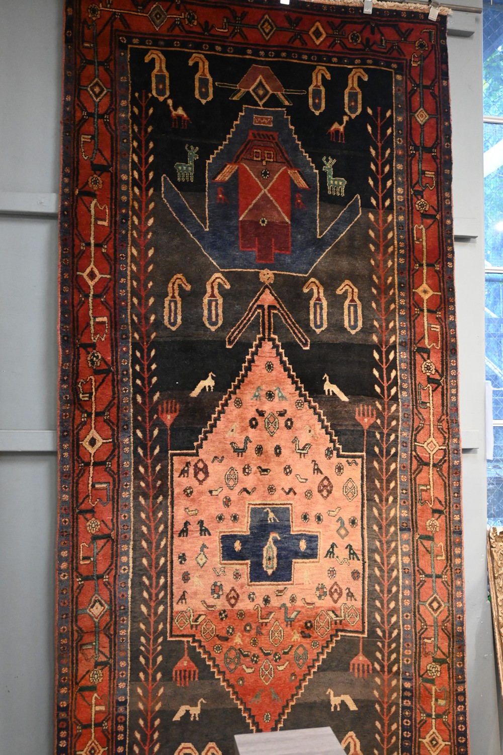 A MAGNIFICENT KAKABERU PERSIAN RUG. 100% WOOL, ORGANIC DYES, SOLOD AND DENSE. WOVEN BY KURDISH NOMADS FROM NORTHWEST IRAN. CENTRAL HEXAGONAL ANCHORED MEDALLION CONTAINING TRIBAL MOTIFS AND ANIMAL FORM, SIDE MEDALLIONS OF TRIBAL PAISLEY MOTIFS IN A RICH CHARCOAL FIELD. DEEP RICH COLOURS OF DEEP BLUE, CHARCOAL AND TERRACOTTA ALL OVER. BORDER OF ROSETTES AND TRIBAL MOTIFS & TREE OF LIFE. SIZE: 377X146CM ORIGIN: PERSIA - RRP: $4,500 DOCUMENTATION OF AUTHENTICITY INCLUDED