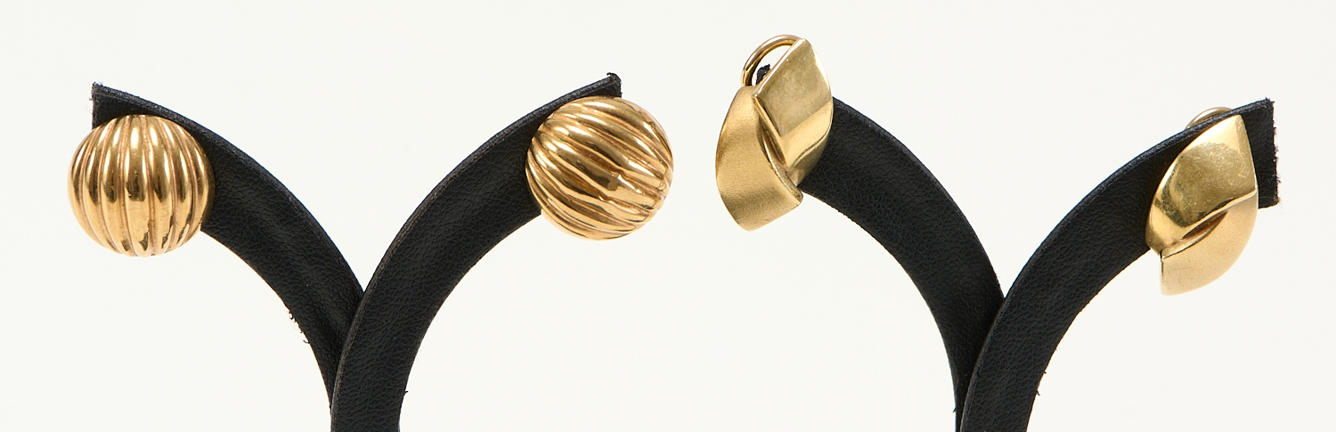 TWO PAIRS OF 9CT GOLD EARRINGS WITH CLIP FITTINGS TOTAL WEIGHT 10.2GMS, THE DOMES APPROXIMATELY 15MM DIAMETER, THE TWISTED 'RIBBONS' APPROXIMATELY 22MM X 11MM