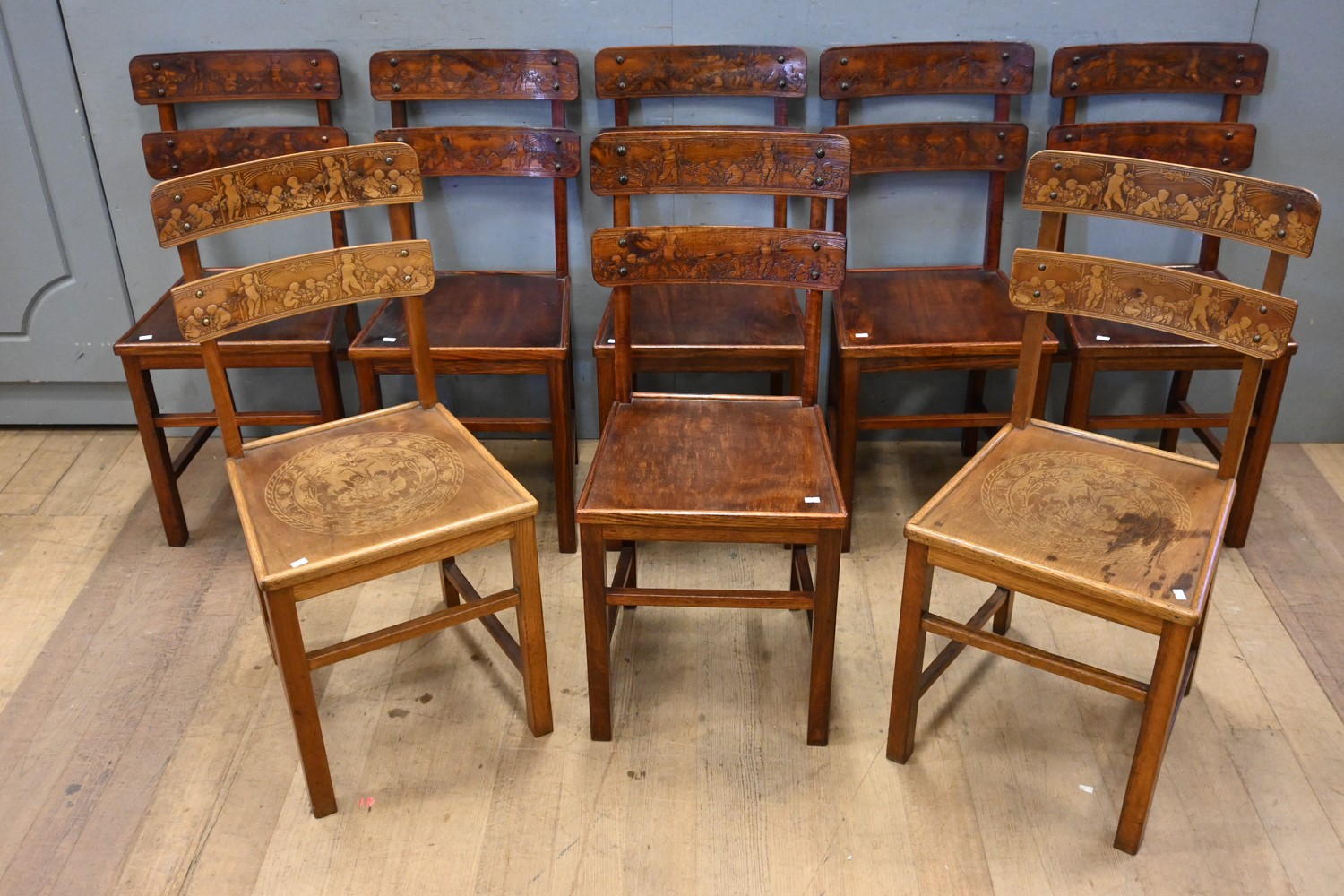 A SET OF EIGHT TIMBER CHAIRS WITH PRESSED CUPID BACKS (A/F) (H89 X W41 X D42 CM)(LEONARD JOEL DELIVERY SIZE: LARGE)