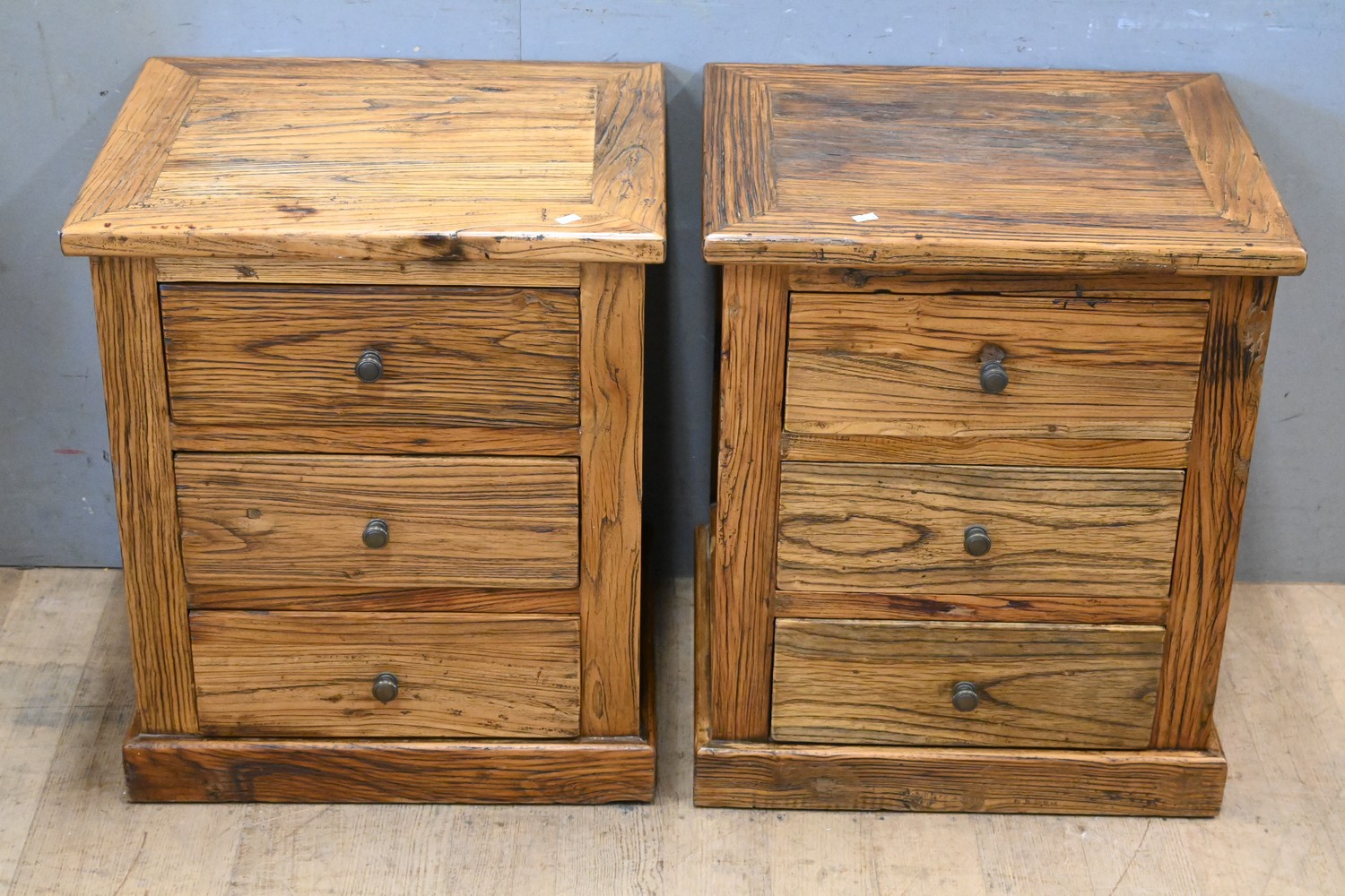 A PAIR OF ELM THREE DRAWER BEDSIDES (H65 X W55 X D46 CM) (PLEASE NOTE THIS HEAVY ITEM MUST BE REMOVED BY CARRIERS AT THE CUSTOMER'S EXPENSE. LEONARD JOEL STAFF CANNOT ASSIST CARRYING THIS ITEM) (X-LARGE ITEM)