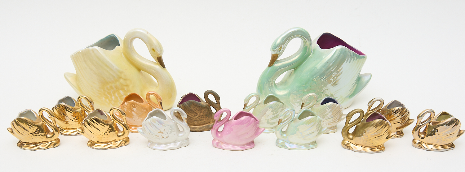 A LARGE COLLECTION OF WEMBLEY WARE LUSTRE GLAZED SWANS H.20CM (TALLEST), LEONARD JOEL LOCAL DELIVERY SIZE: MEDIUM