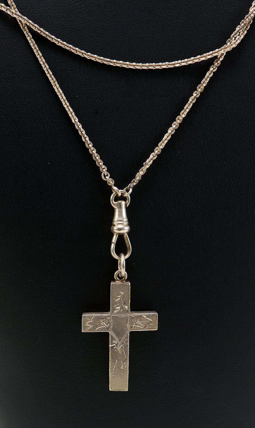AN ANTIQUE ENGRAVED CROSS TO A FINE SILVER GUARD CHAIN IN SILVER, TOTAL LENGTH APPROXIMATELY 692MM