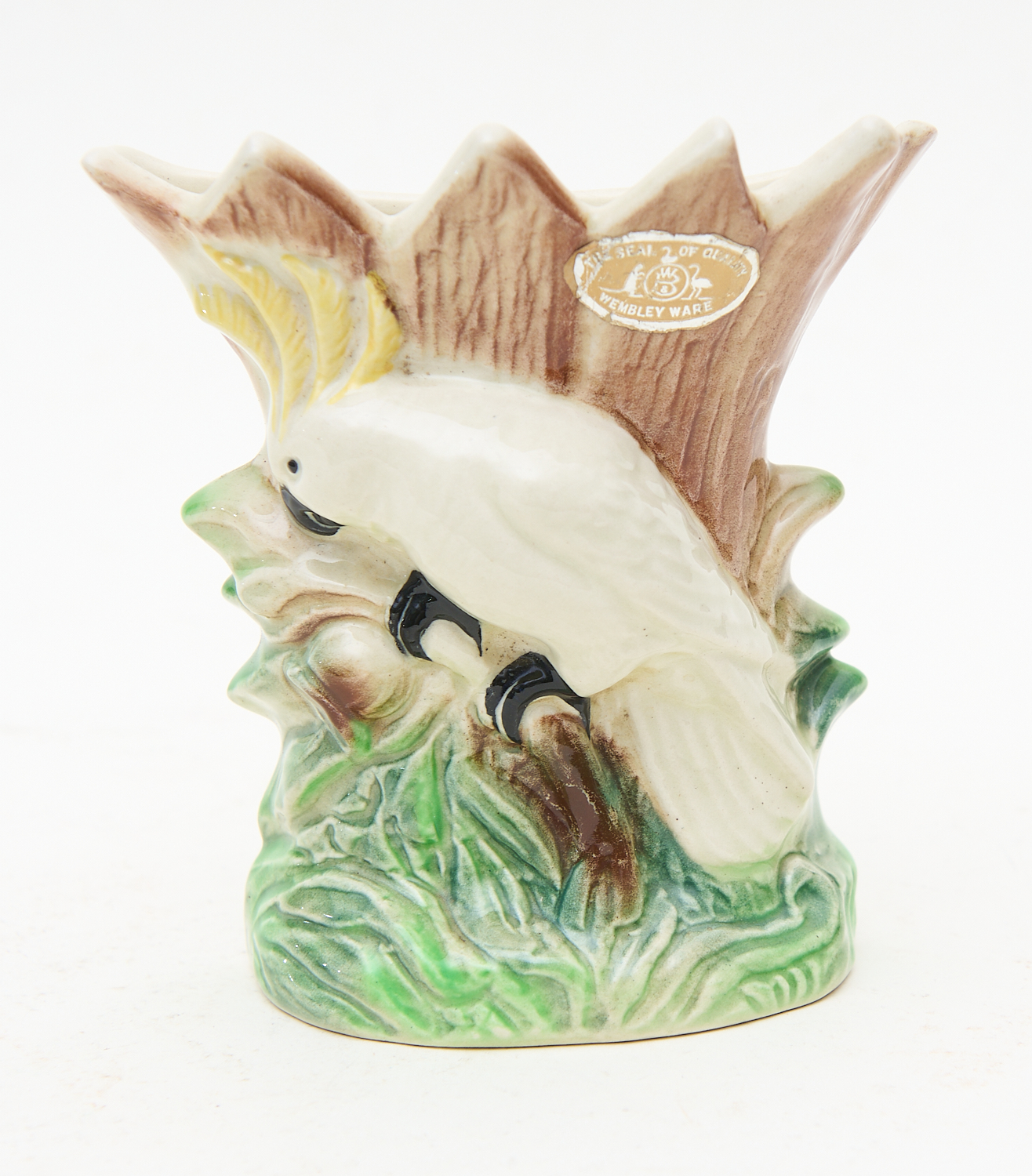 A WEMBLEY WARE WALL POCKET WITH YELLOW CRESTED COCKATOO DECORATION AND LUSTRE GLAZE H.13.5CM, LEONARD JOEL LOCAL DELIVERY SIZE: SMALL