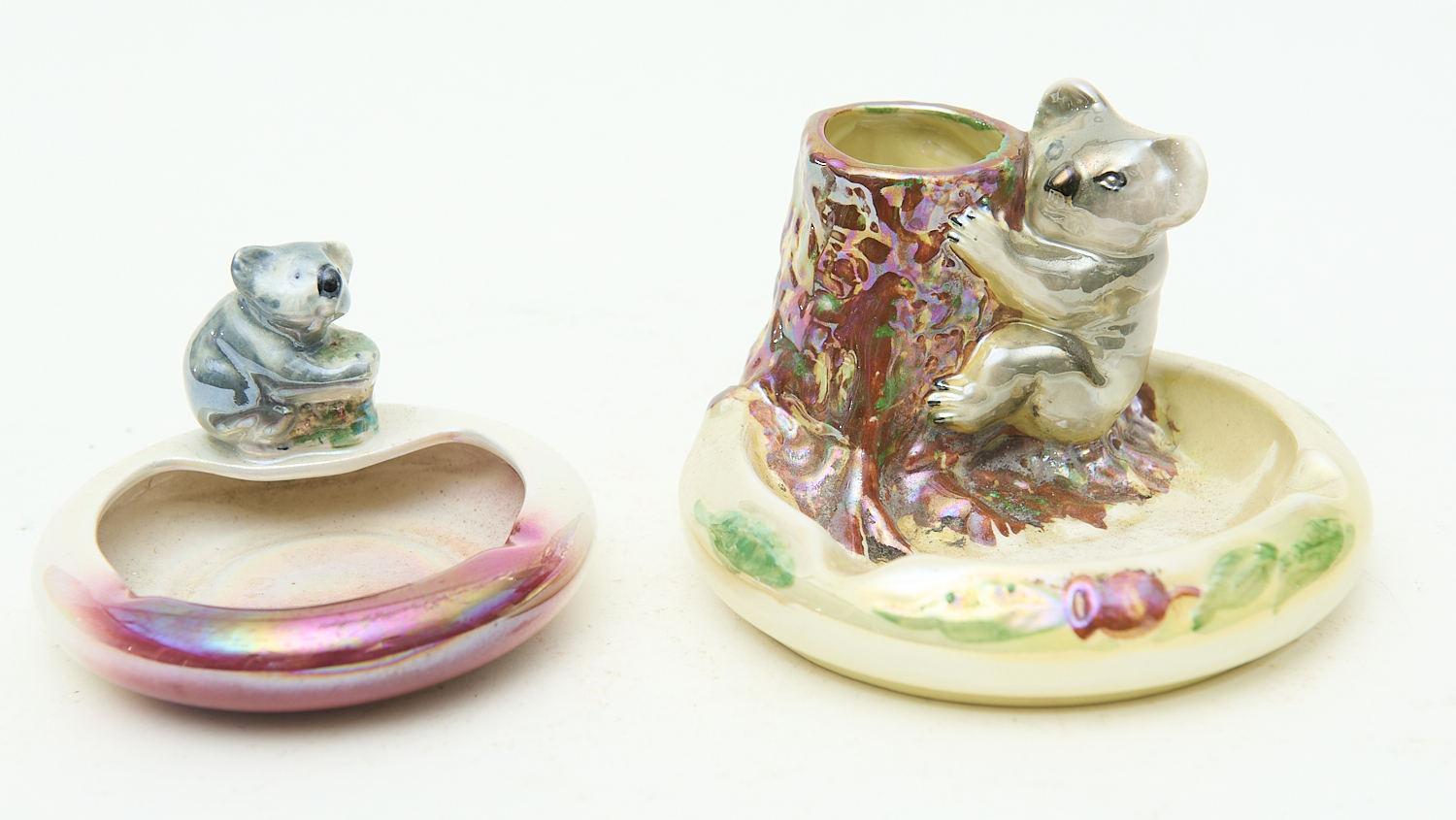 TWO LUSTRE GLAZED WEMBLEY WARE KOALA THEMED ASHTRAYS DIA.13CM, LEONARD JOEL LOCAL DELIVERY SIZE: SMALL
