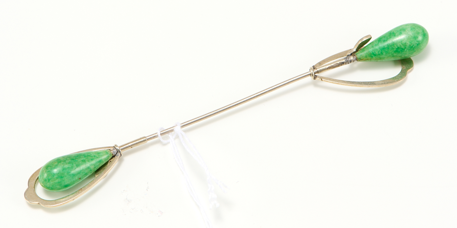 A GREEN PEKING GLASS AND SILVER JABOT PIN, LENGTH APPROXIMATELY 111MM