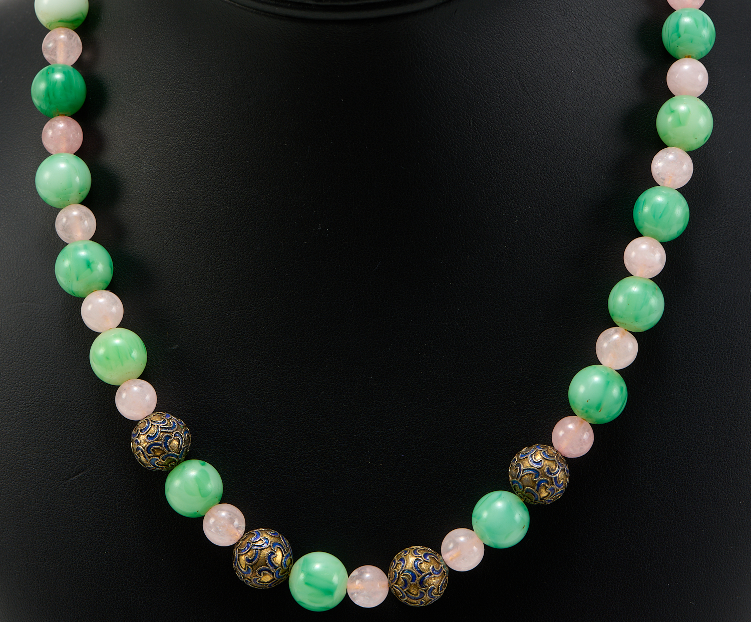 A STRAND OF ROSE QUARTZ, GLASS AND ENAMEL BEADS, TOTAL LENGTH APPROXIMATLEY 503MM