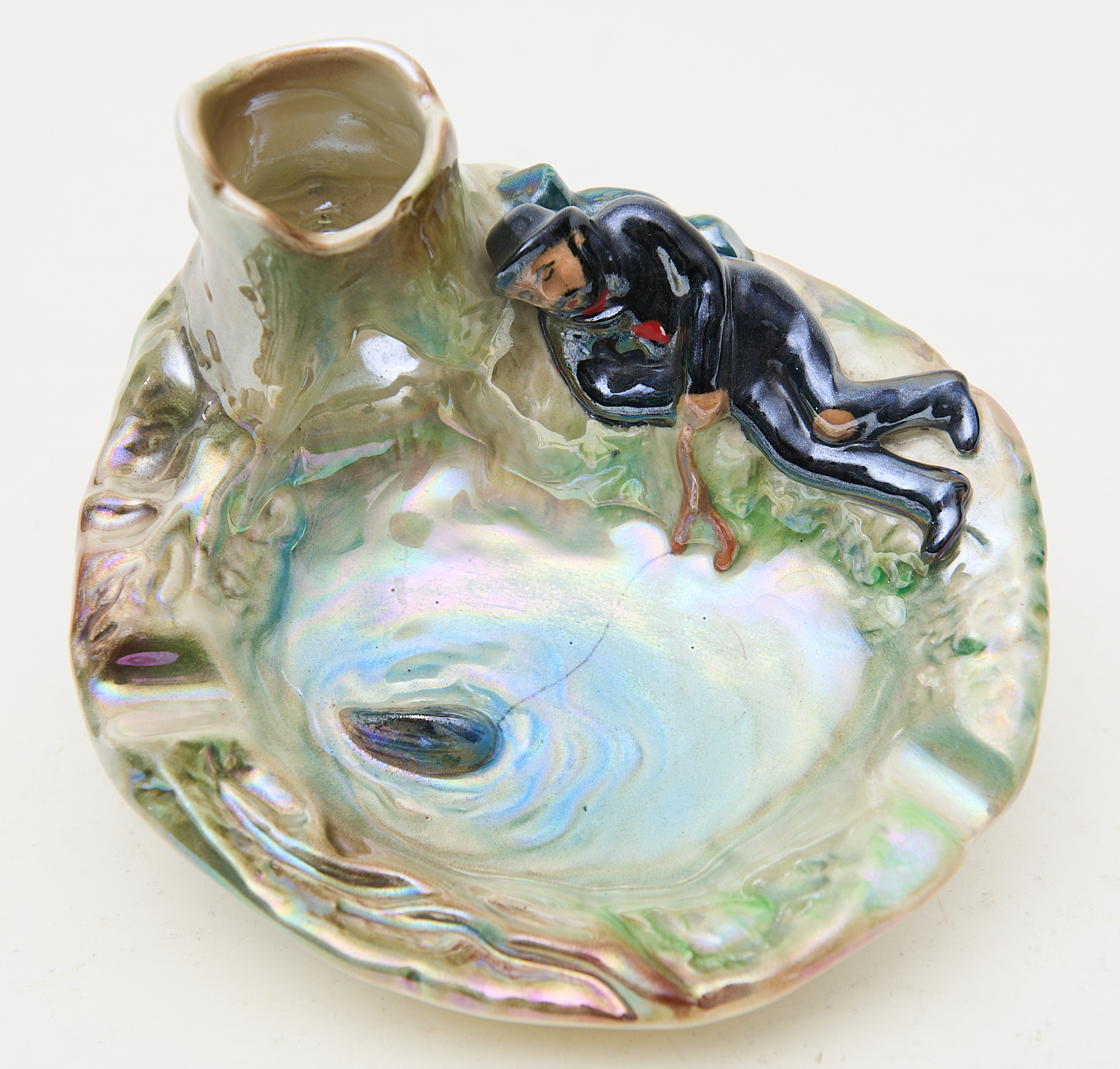 A WEMBLEY WARE SWAGMAN FISHING LUSTRE GLAZED ASHTRAY DIA.16CM, LEONARD JOEL LOCAL DELIVERY SIZE: SMALL