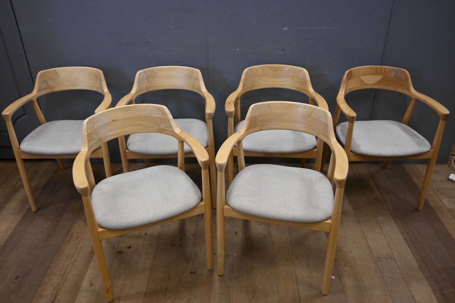 A SET OF SIX MID-CENTURY STYLE CHAIRS IN OATMEAL FABRIC (A/F) ( 77H X 53W X 53D CM) (LEONARD JOEL DELIVERY SIZE: LARGE)