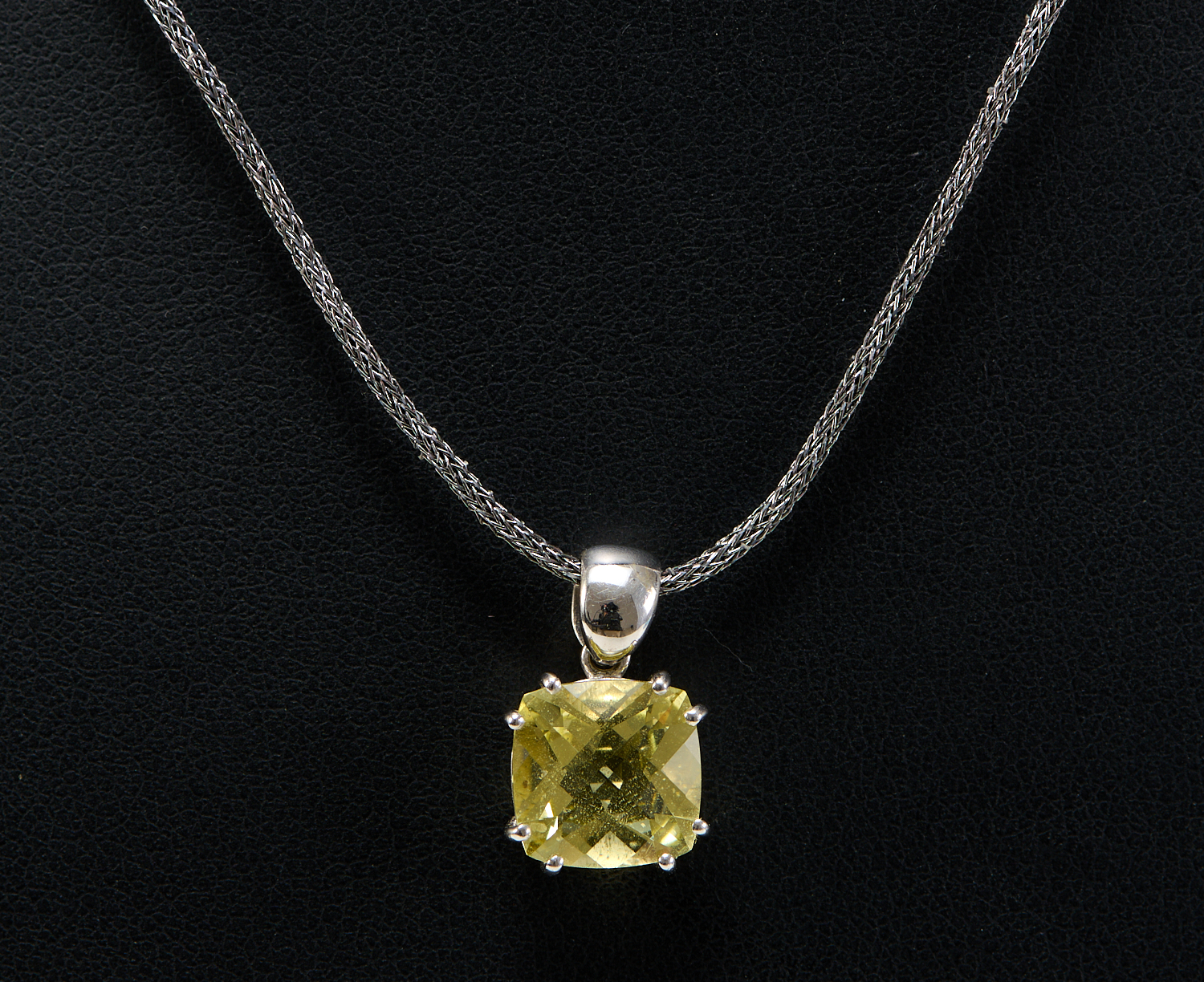 CHECKERBOARD CUT LEMON QUARTZ SET PENDANT IN 9CT WHITE GOLD SUSPENDED FROM A FINE SILK CORD NECKLACE, LENGTH APPROXIMATELY 430MM