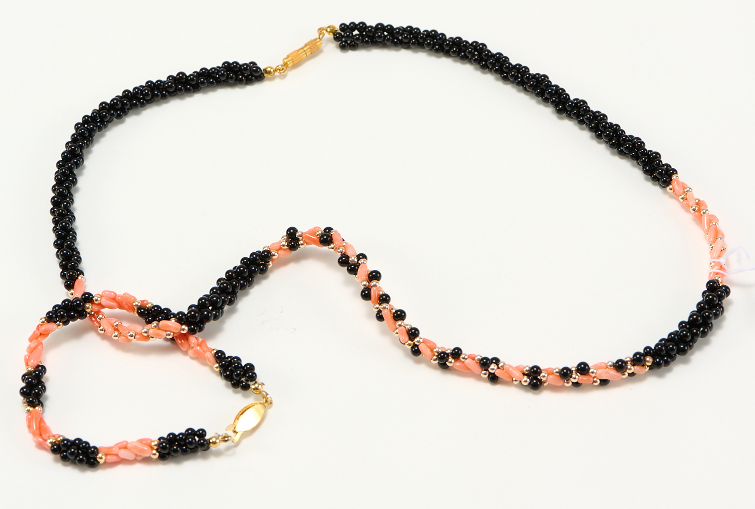 A RED AND BLACK CORAL NECKLACE AND MATCHING BRACELET TO GOLD PLATED CLASPS, BRACELET LENGTH APPROXIMATELY 170MM, NECKLACE LENGTH APPROXIMATELY 570MM