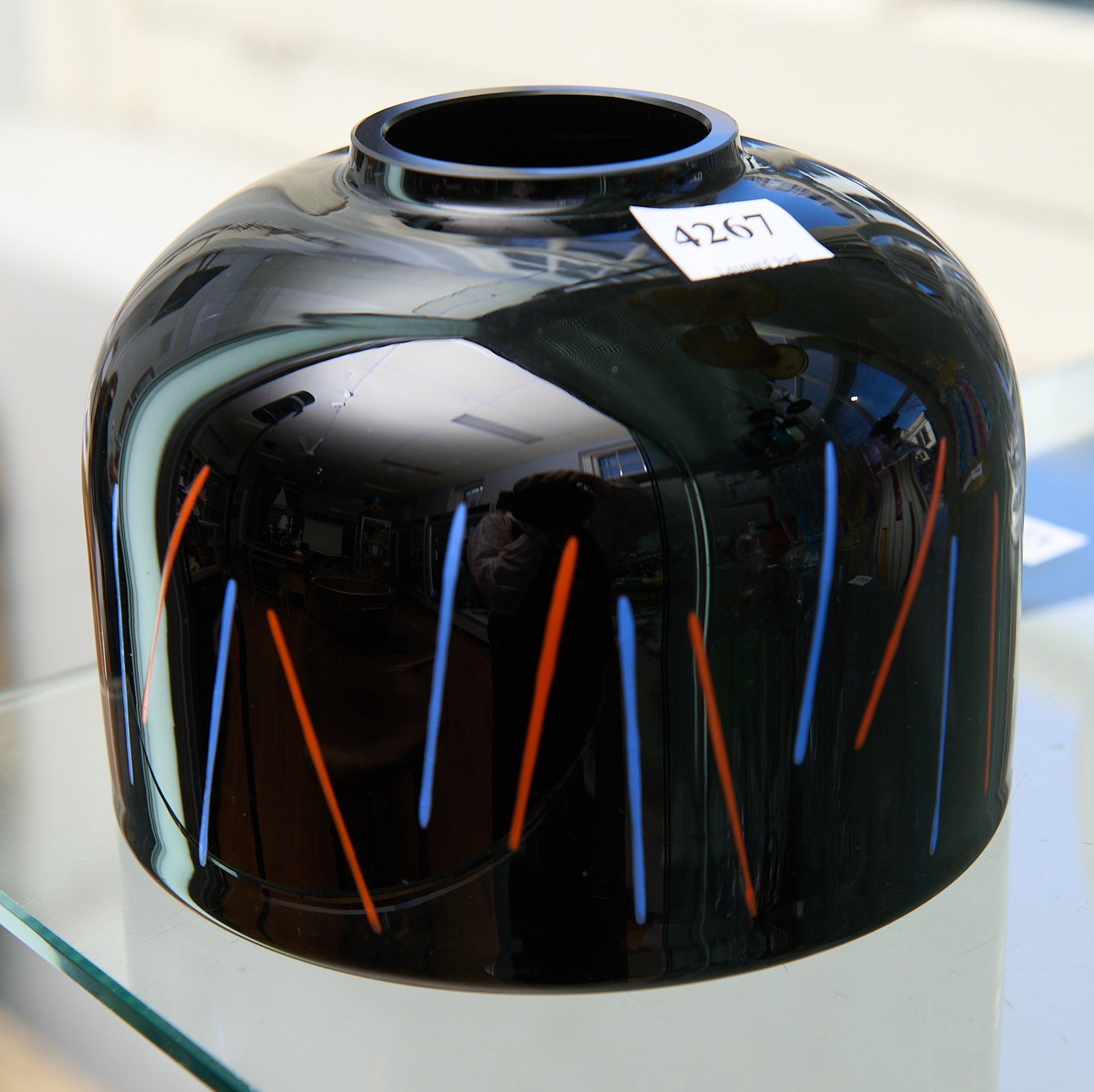 A 1980'S BLACK GLASS VASE WITH ENAMEL DECORATION DIA.14.5CM, LEONARD JOEL LOCAL DELIVERY SIZE: SMALL