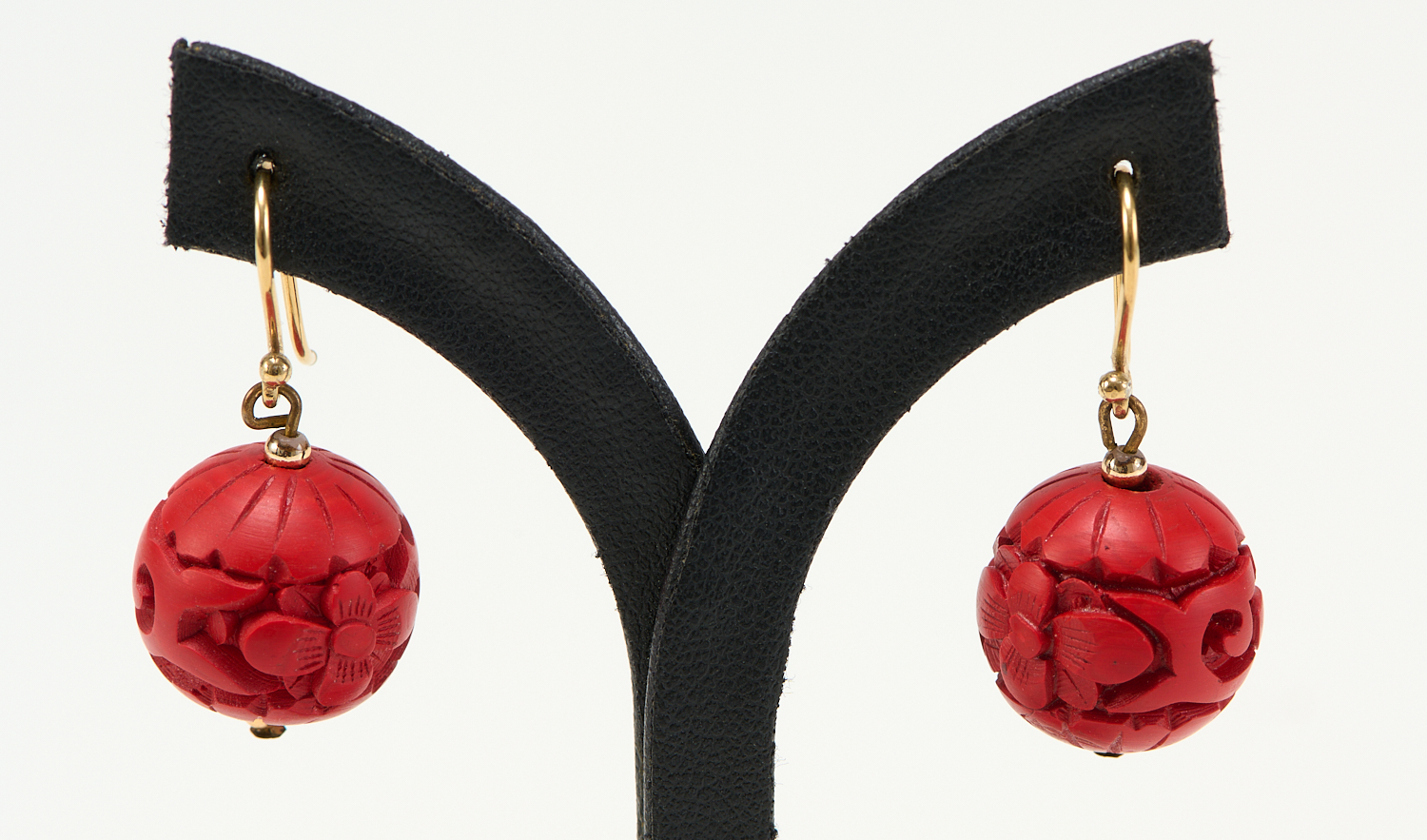 PAIR OF CARVED CINNABAR BEAD EARRINGS WITH 9CT GOLD HOOK FITTINGS, BEADS APPROXIMATELY 16MM DIAMETER