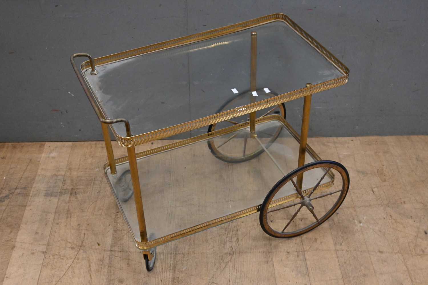 A BRASS AND GLASS TWO TIER AUTO TROLLEY WITH GALLERY EDGING (65H x 77W x 44D CM) (LEONARD JOEL DELIVERY SIZE: LARGE)