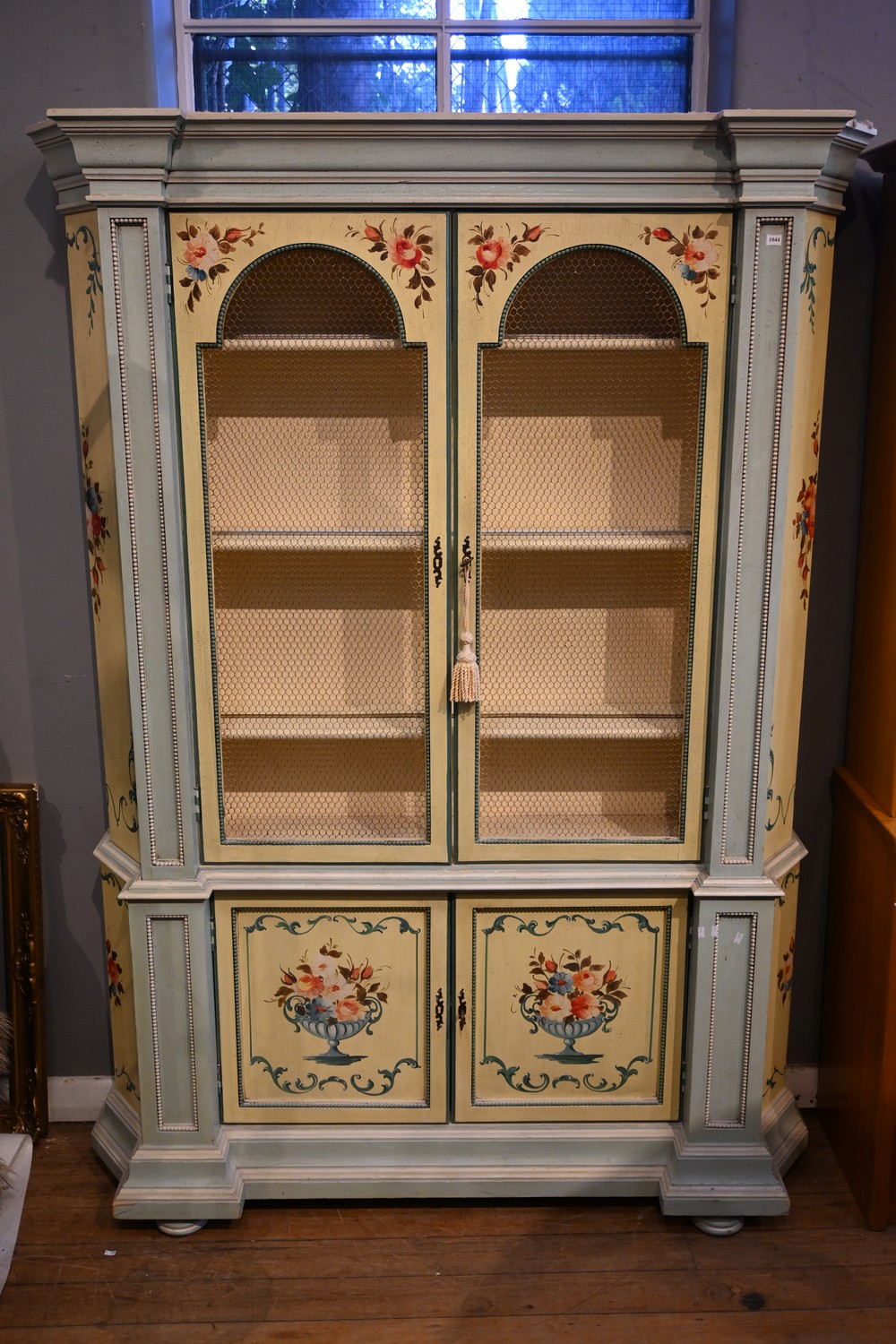 AN ITALIAN DOUBLE BODIED CABINET WITH HAND PAINTED DETAILING (206H x 140W x 37D CM) (PLEASE NOTE THIS HEAVY ITEM MUST BE REMOVED BY CARRIERS AT THE CUSTOMER'S EXPENSE. LEONARD JOEL STAFF CANNOT ASSIST CARRYING THIS ITEM) (X-LARGE ITEM)