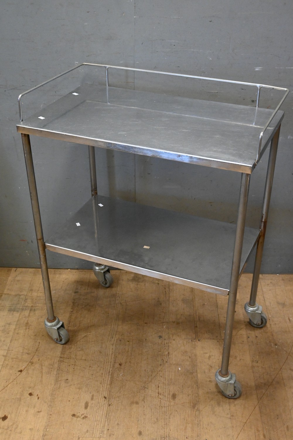 A STAINLESS STEEL TWO TIER HOSPITAL TROLLEY ON WHEELS ( 100H X 79W X 48D CM) (LEONARD JOEL DELIVERY SIZE: LARGE)