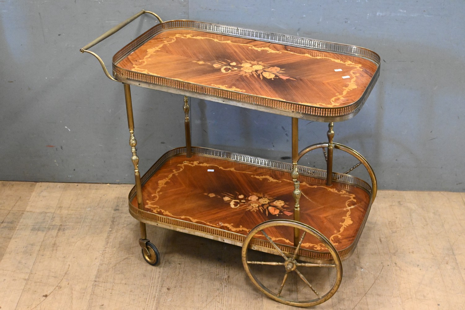 A SUPERB 1960S ITALIAN INLAID 2 TIER BRASS FRAMED DRINKS TROLLEY WITH BRASS GALLERY AND WHEELS (H72 X W83 X D51 CM) (LEONARD JOEL DELIVERY SIZE: LARGE)
