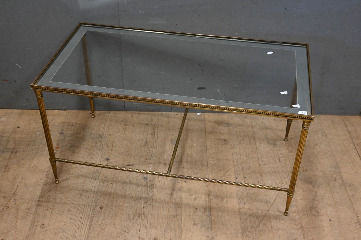 AN ITALIAN BRASS FRAMED GLASS TOPPED RECTANGULAR COFFEE TABLE (A/F) ( 47H X 91W X 48D CM) (LEONARD JOEL DELIVERY SIZE: LARGE)