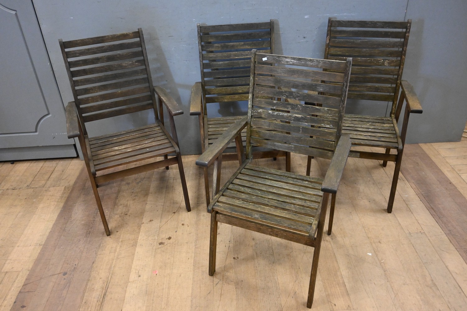 A SET OF FOUR SOLID TEAK AUSTRALIAN MADE OUTDOOR ARM CHAIRS (H102 X W60 X D57 CM) (LEONARD JOEL DELIVERY SIZE: LARGE)