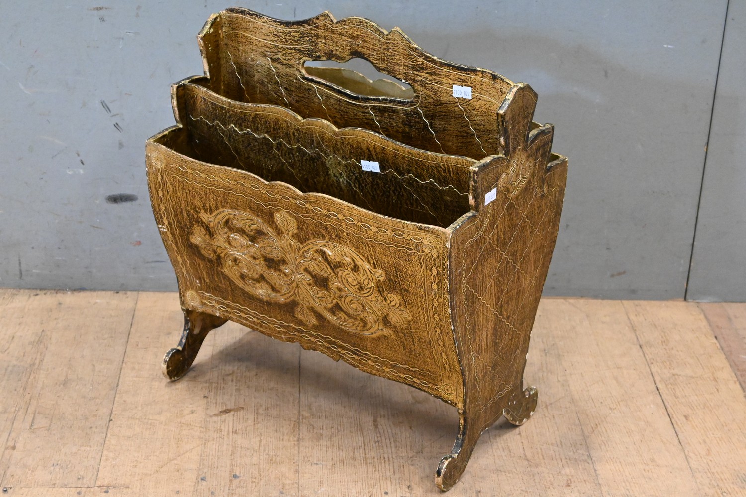 AN ITALIAN GILTWOOD FLORENTINE FOUR SECTION MAGAZINE RACK (H45 X W39 X D46 CM) (LEONARD JOEL DELIVERY SIZE: MEDIUM)