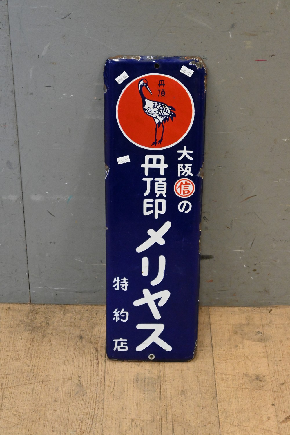 A 1940S ORIGINAL JAPANESE ENAMEL ADVERTISING SIGN BLUE WHITE AND RED WITH CRANE (H61 CM) (LEONARD JOEL DELIVERY SIZE: MEDIUM)