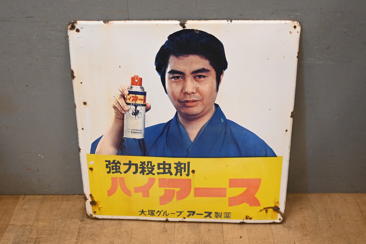 A LARGE SQUARE JAPANESE ENAMEL ADVERTISING SIGN - FLY SPRAY (90 X 90CM) (LEONARD JOEL DELIVERY SIZE: MEDIUM)