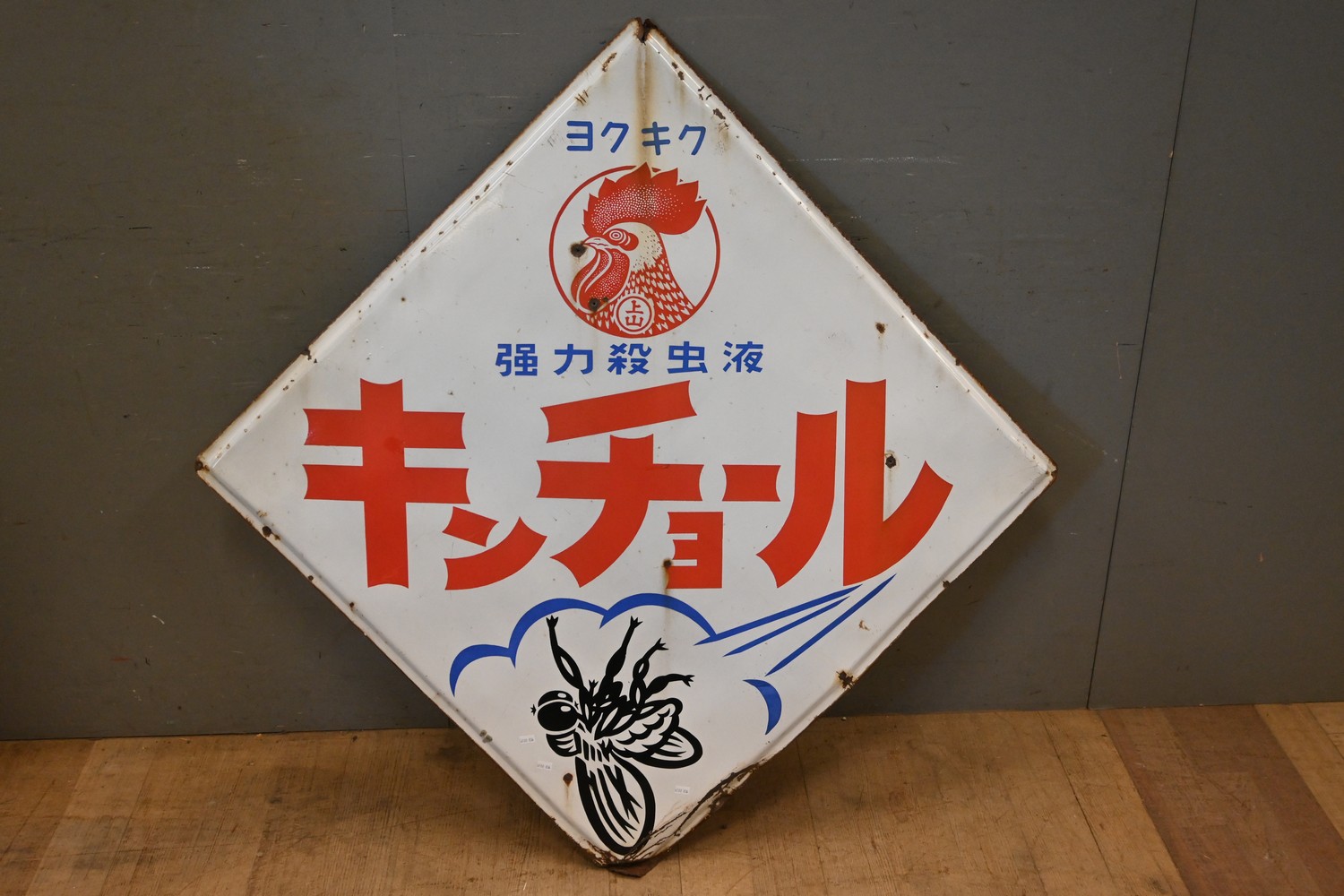 A LARGE SQUARE 1940S ORIGINAL JAPANESE ENAMEL ADVERTISING SIGN - FLY AND CHICKEN MOTIFS (92 X 92 CM) (LEONARD JOEL DELIVERY SIZE: LARGE)