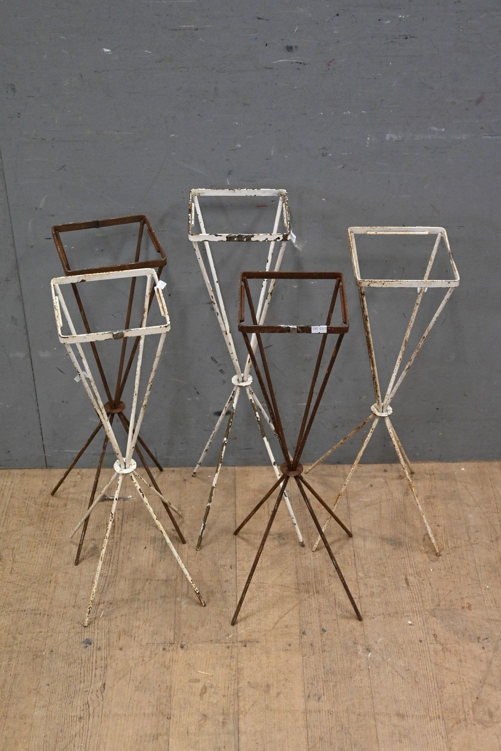 A GROUP OF FIVE MID CENTURY STEEL SQUARE FORM PLANTER STANDS (63H CM) (LEONARD JOEL DELIVERY SIZE: MEDIUM)