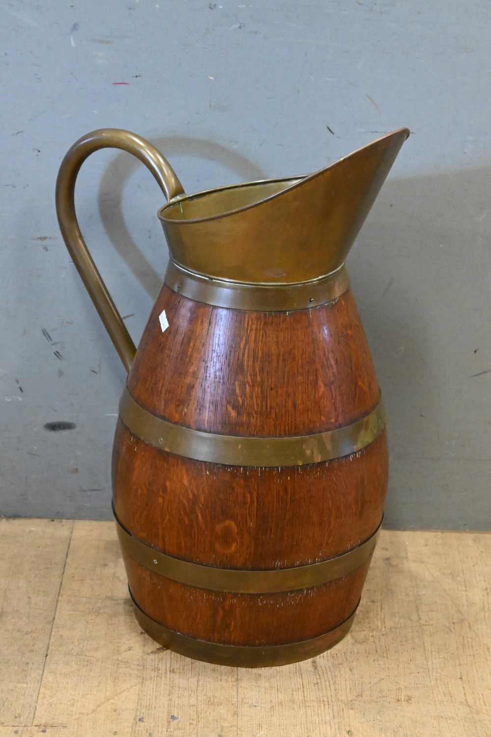A LARGE FRENCH COOPERED OAK AND BRASS MOUNTED TAVERN JUG (H62 CM) (LEONARD JOEL DELIVERY SIZE: MEDIUM)