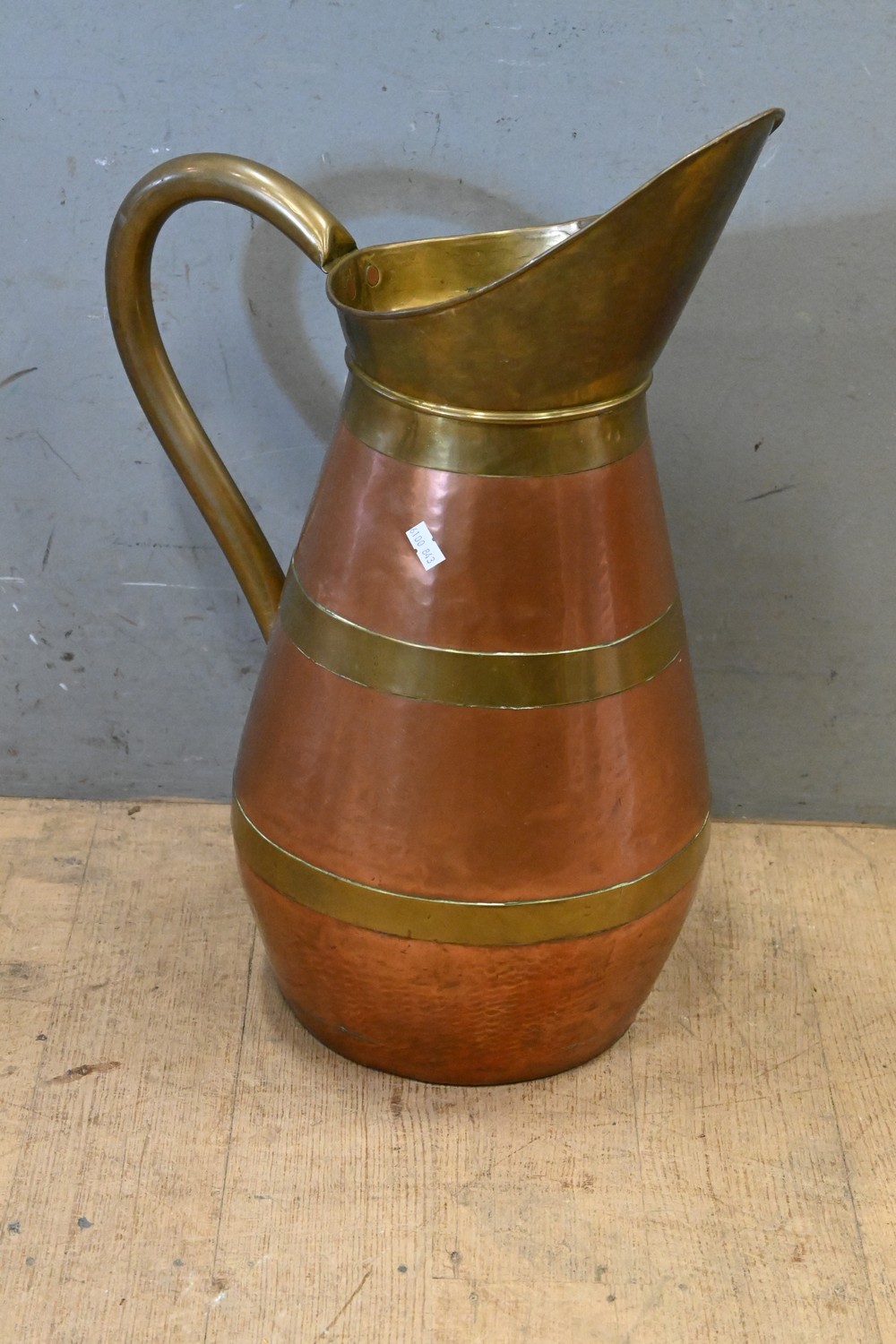 A LARGE FRENCH COPPER AND BRASS TAVERN JUG (H52 CM) (LEONARD JOEL DELIVERY SIZE: MEDIUM)