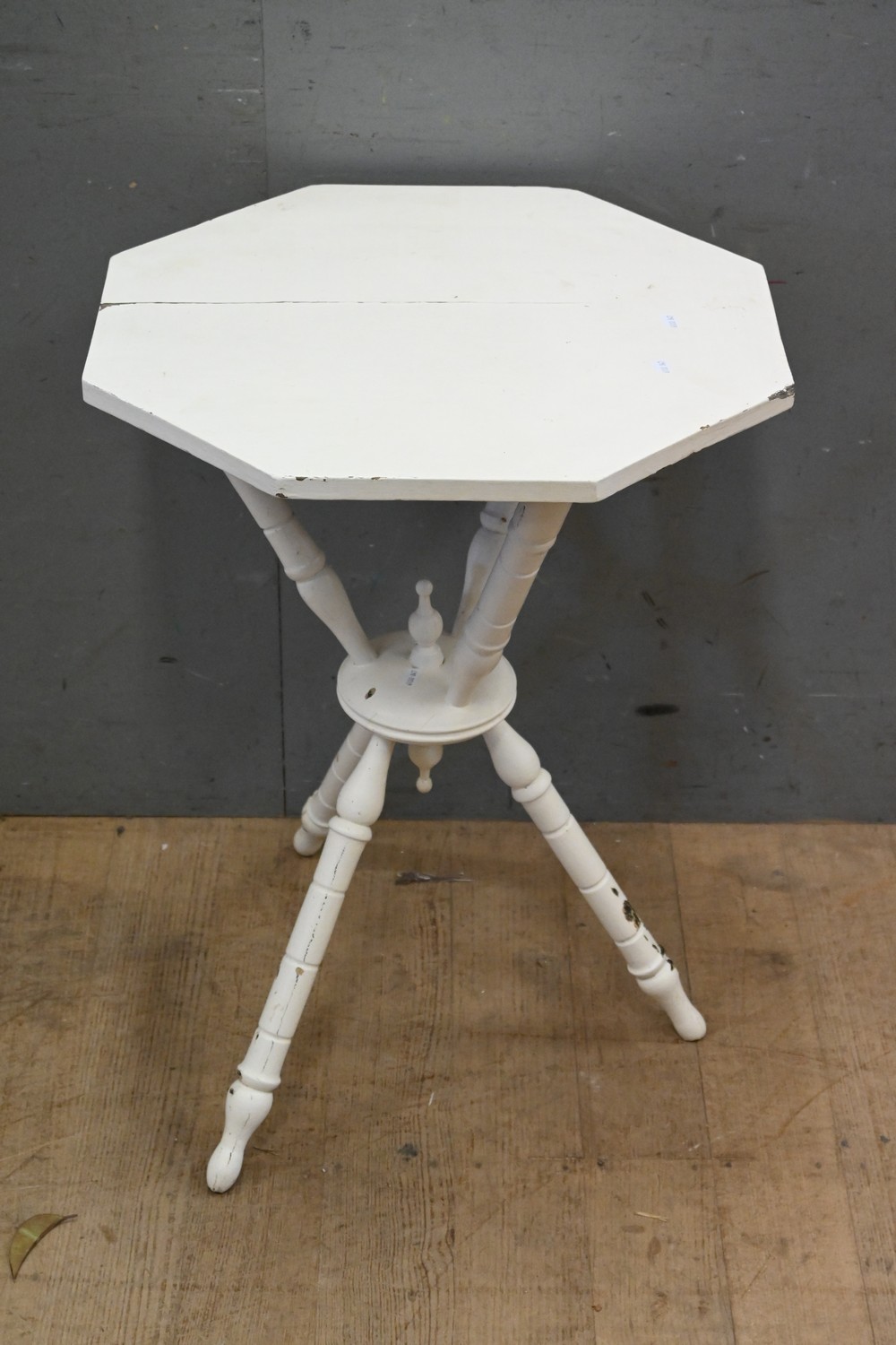 AN AUSTRALIAN PAINTED WHITE PINE THREE LEGGED OCTAGONAL TOPPED CRICKET TABLE (A/F) (68H x 49D CM) (LEONARD JOEL DELIVERY SIZE: LARGE)