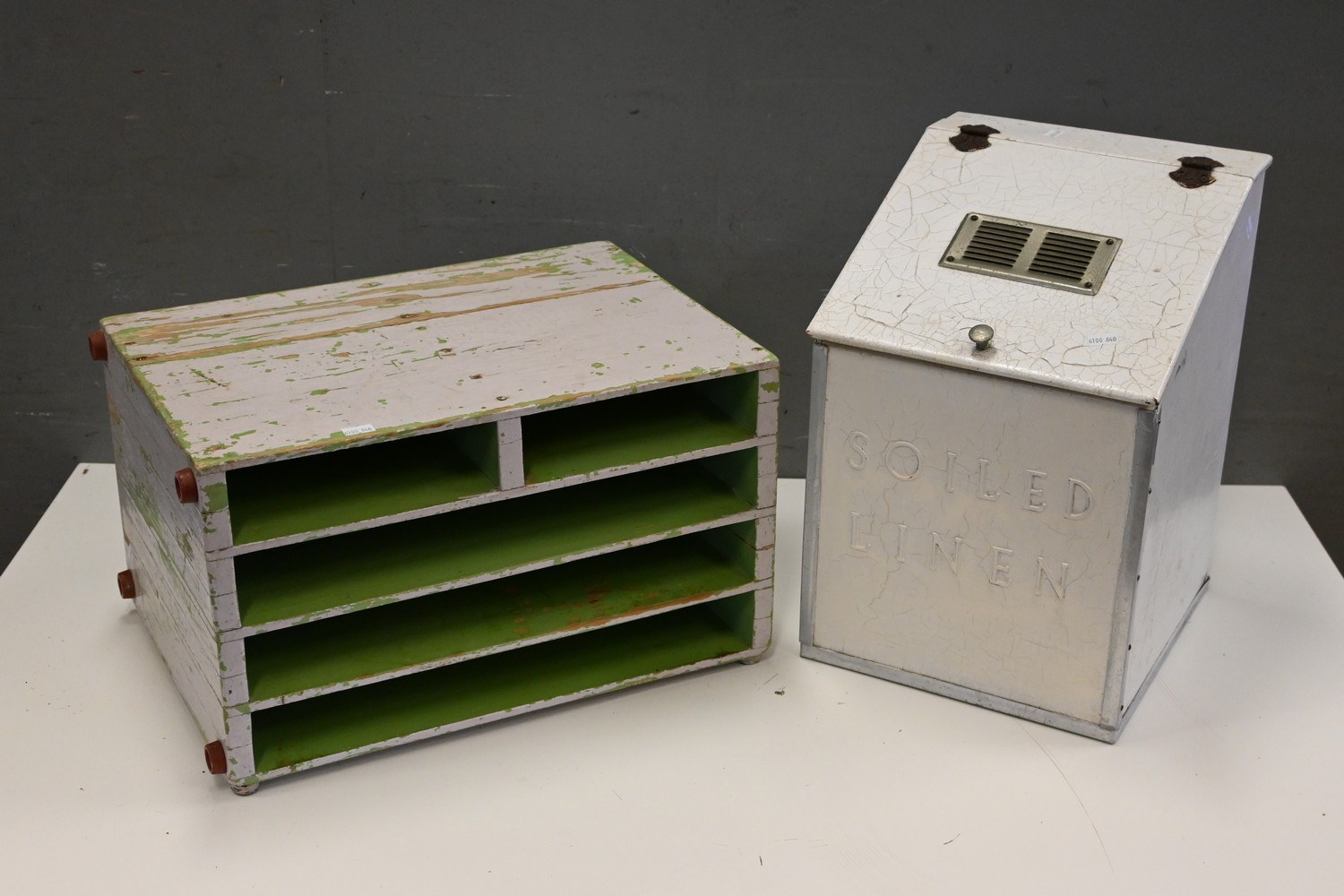 A FIVE SECTION PAINTED WHITE WOODEN FILING CABINET AND WOODEN SOILED LINEN BOX (A/F) (27H x 45W x 31D CM) (LEONARD JOEL DELIVERY SIZE: LARGE)