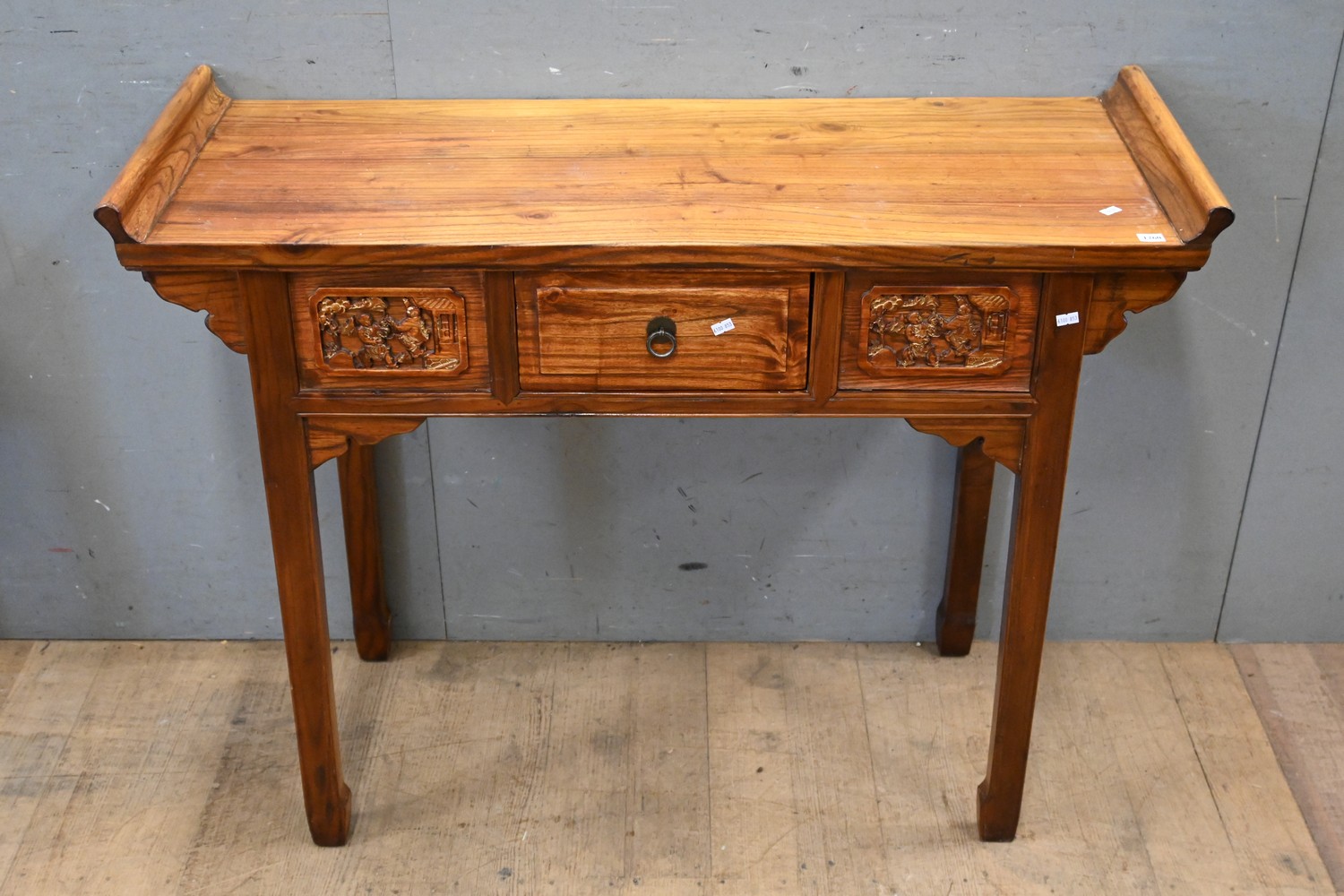 A VINTAGE CHINESE CARVED WOODEN SIDETABLE WITH RELIEF ORIENTAL SCENES AND CENTRAL DRAWER ( 86H X 111W X 40D CM) (LEONARD JOEL DELIVERY SIZE: LARGE)