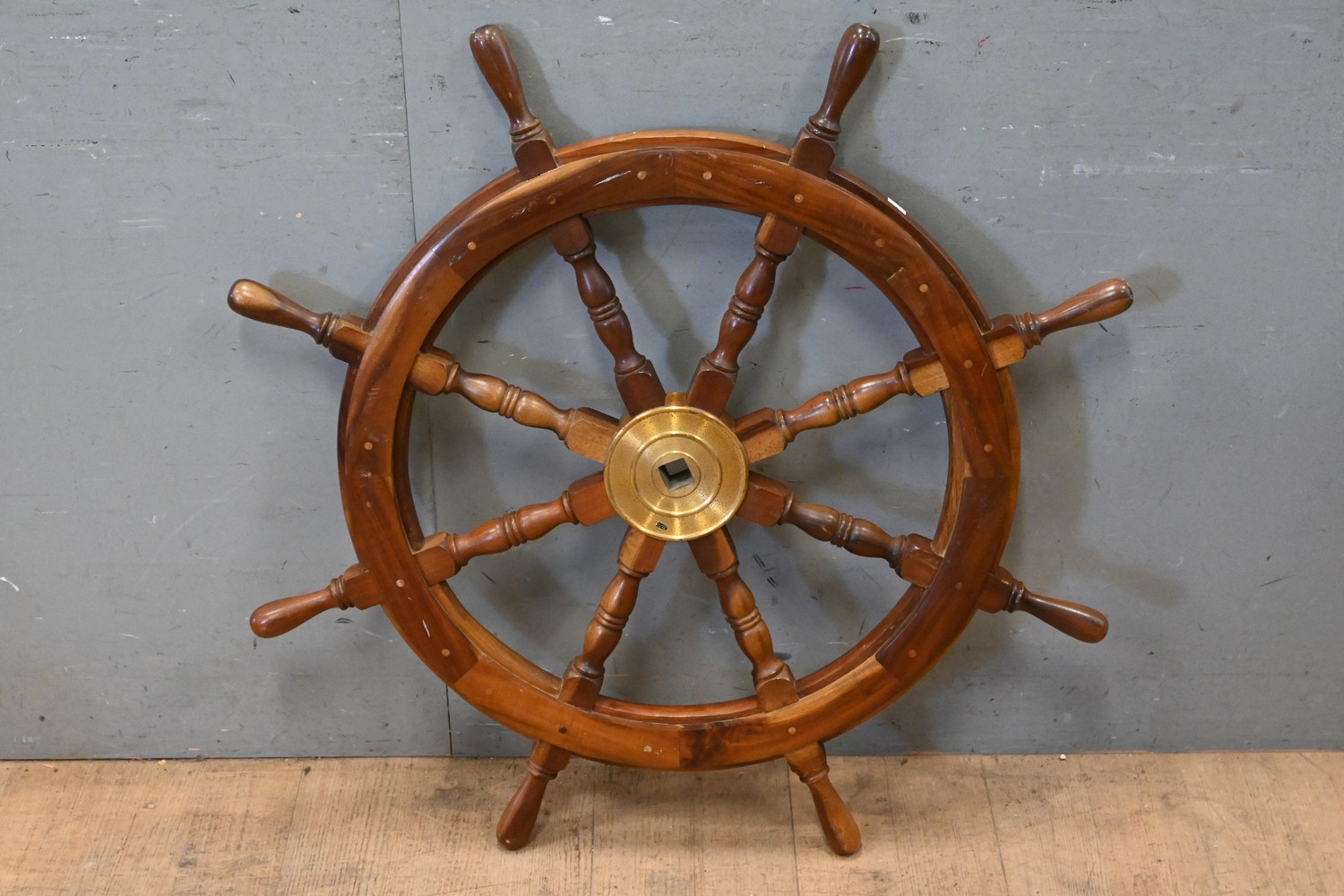A 1940S LARGE WOODEN AND BRASS SHIPS STEERING WHEEL (D95 CM) (LEONARD JOEL DELIVERY SIZE: MEDIUM)