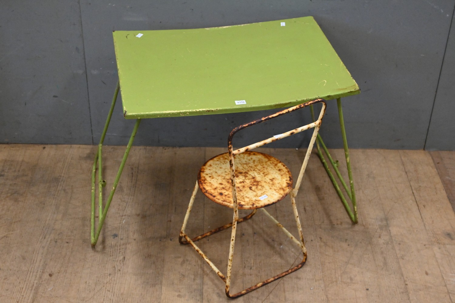 A METAL CHILDRENS TABLE AND CHAIR (A/F) ( 47H X 70W X 43D CM) (LEONARD JOEL DELIVERY SIZE: MEDIUM)