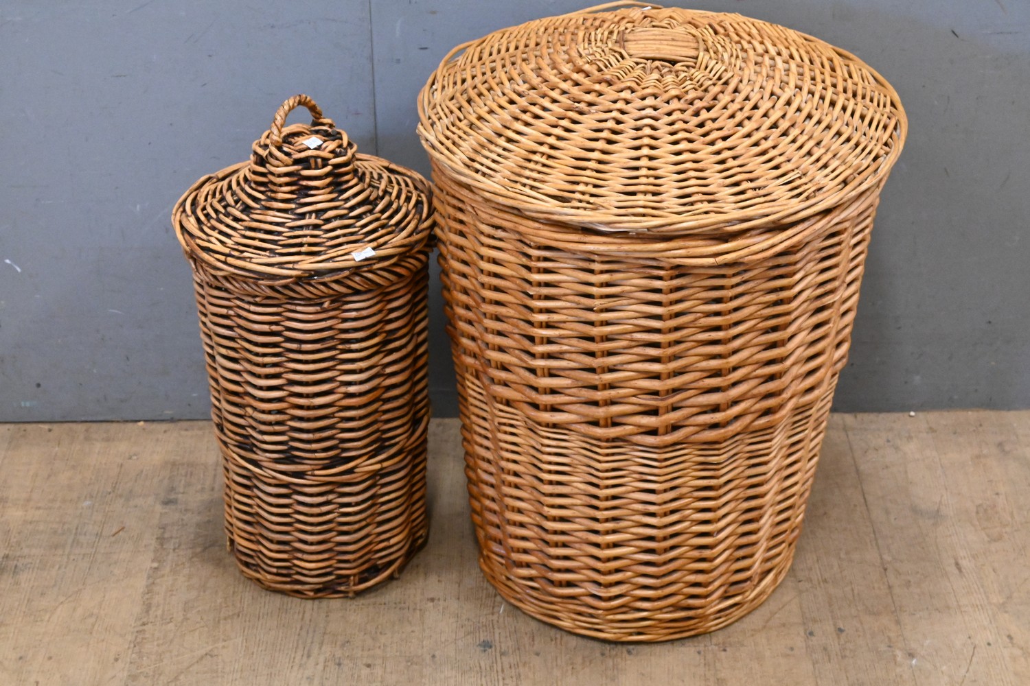 TWO 1960S HEAVY GAUGE WOVEN CANE LIDDED BASKETS (H66 X D52 CM) (LEONARD JOEL DELIVERY SIZE: MEDIUM)